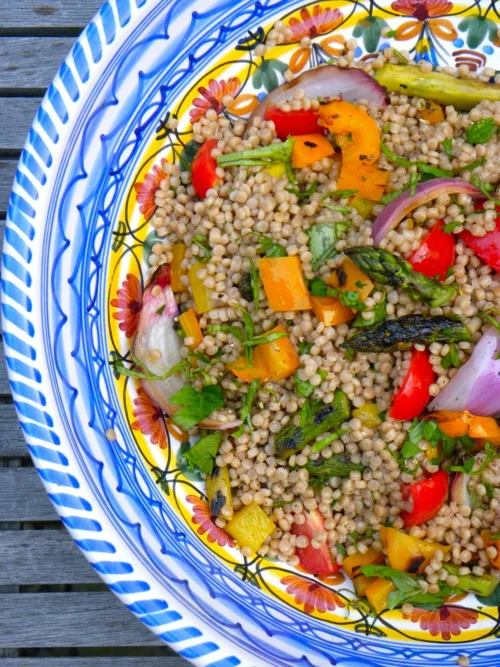 In a serving bowl, gently combine the couscous, bell peppers, asparagus, red onion, basil, parsley and reserved marinade. Season to taste with coarse salt and freshly ground black pepper.