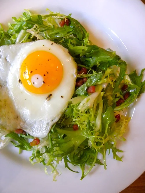 Hit the frisee with a good three-fingered pinch of salt and just enough dressing to coat the leaves. Toss well. Divide the frisee among four plates. Scatter the prosciutto over the greens and top each plate with an egg.