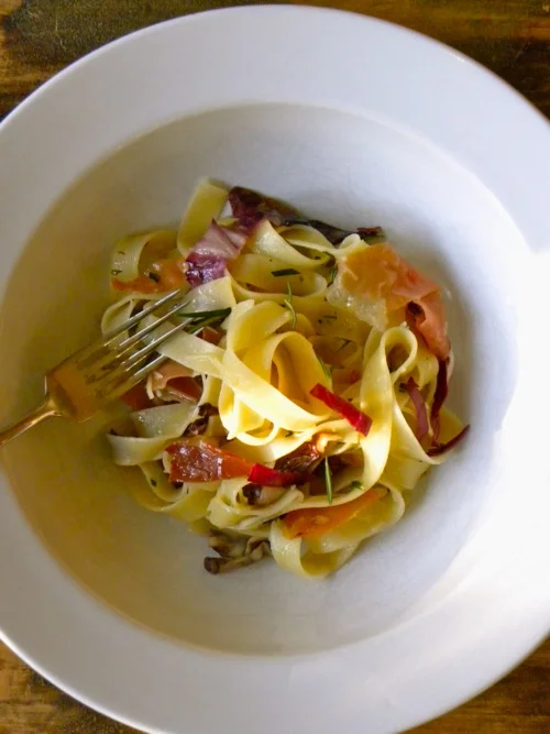 Toss the pasta into a pot of nicely salted, boiling water. When al dente, drain the pasta and turn it out into the nonstick pan with the prosciutto/radicchio mixture over medium heat. Add the remaining butter, parmesan and reserved radicchio. Give the pasta a healthy toss and divide it among plates. Pass a bit of extra parmesan, sea salt and black pepper at the table.