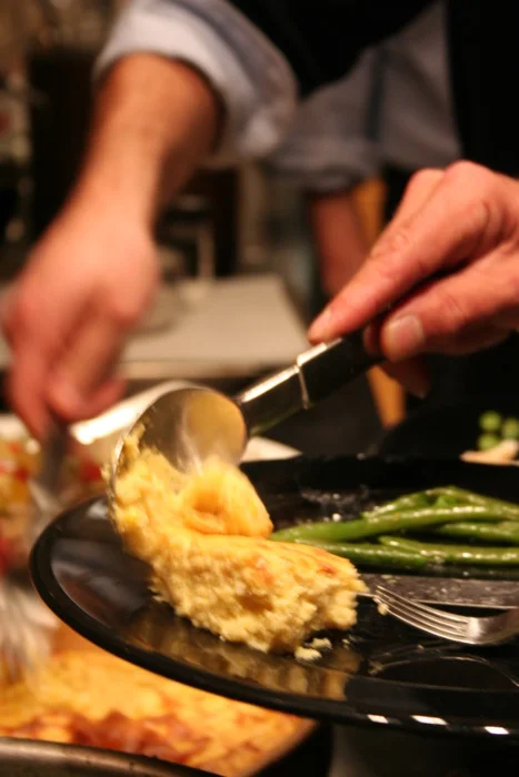 There’s nothing more welcome on our dinner plates than a good fist-sized wedge of this sun-yellow spoon bread. It’s a great accompaniment to almost any meal – here, pan roasted cod with some haricots verts and edamame all gussied up with truffle salt and truffle butter.
