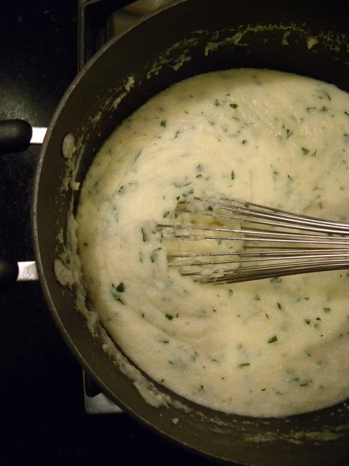 Remove the pot from the heat and hit the polenta with the cheese, milk, butter and herbs. Crack a bit of black pepper over the polenta and stir to combine. Taste and adjust the seasonings, adding a bit more butter or cheese if you like (never a bad idea, to our mind!).
